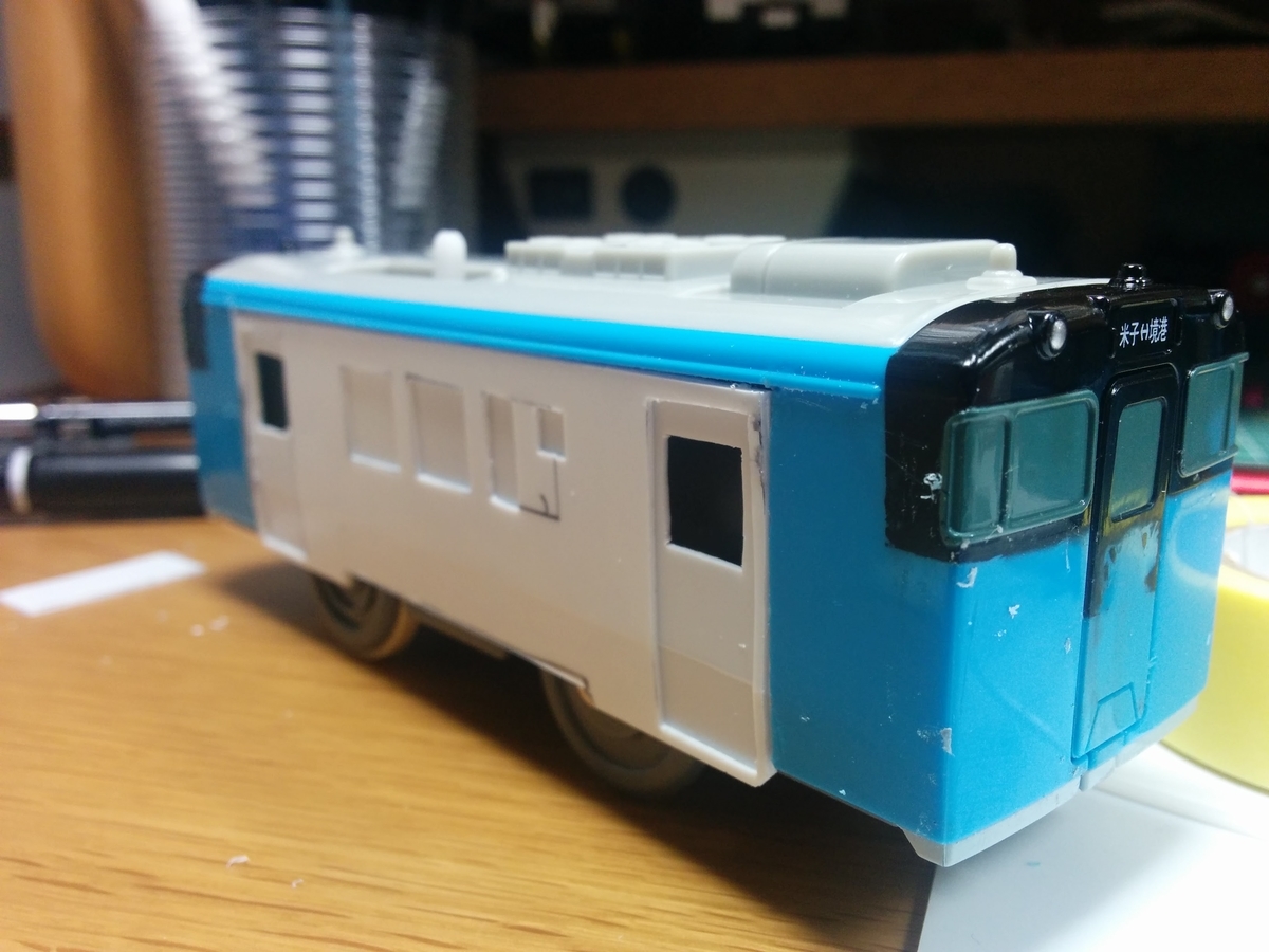 乗務員扉はPカッターでモールドを掘り,窓も開口します.